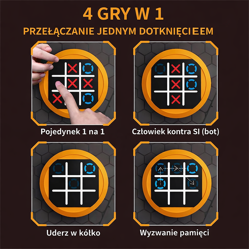 🎮 XOXO Fun – graj sam, z przyjacielem lub odkryj tajne wyzwania! W trybie solo zmierz się z inteligentnym botem, który nigdy nie nudzi, idealny do szybkich rund i treningu strategii. W trybie 2 osoby rywalizuj z kolegą lub rodzeństwem w klasyczne XO aż ktoś wygra, odkrywając nieskończone możliwości gry. A jeśli chcesz czegoś wyjątkowego –Włącz tryb memory musisz zapamiętać kolejność w jakiej bot pokazuje kółka, i kliknąć je w włąściwej kolejności - to doskonały trening . Dodatkowo spróbuj trybu zręcznościowego „Kliker”, gdzie bot pokazuje kółeczka na planszy, a Twoim zadaniem jest w nie trafić jak najszybciej, ćwicząc refleks i szybkie decyzje. XOXO Fun łączy klasykę z nowoczesną elektroniką, zapewniając mnóstwo zabawy dla każdego!